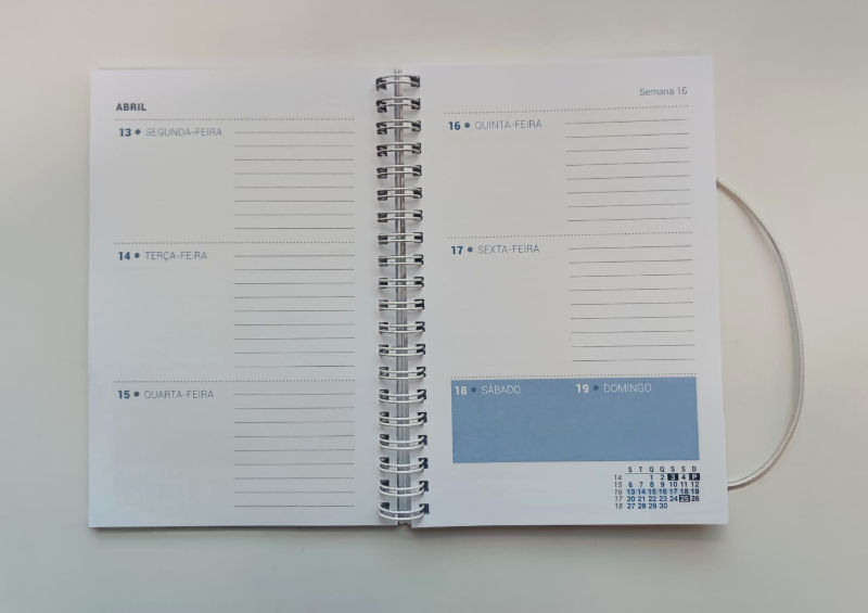 É uma agenda com organização semanal onde pode anotar compromissos diários ou recordar datas especiais.