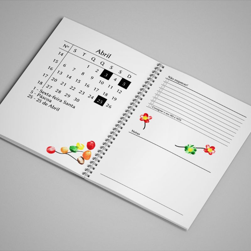 - Inclui: feriados nacionais, espaço para Informações pessoais, notas e contactos