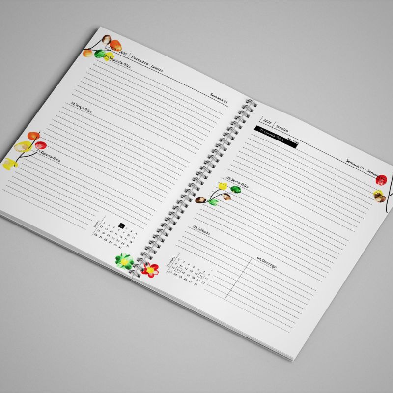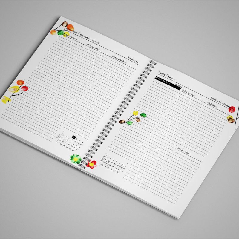 - Calendário civil: ano 2026 (janeiro a dezembro), disposição semanal em dois formatos à escolha: vertical ou horizontal (veja as fotografias acima e indique por favor no campo de mensagem do formulário de contacto qual das opções prefere)