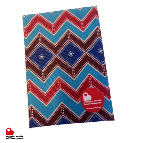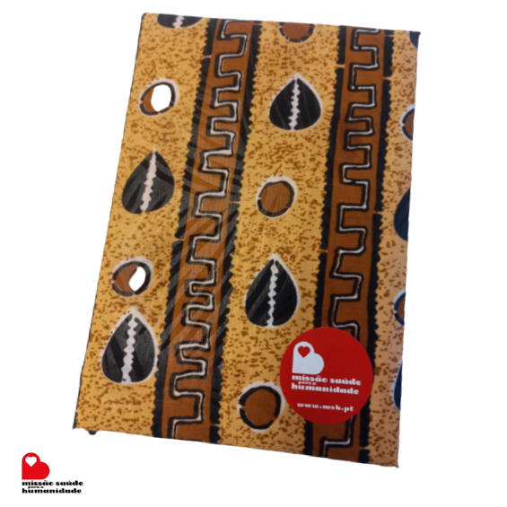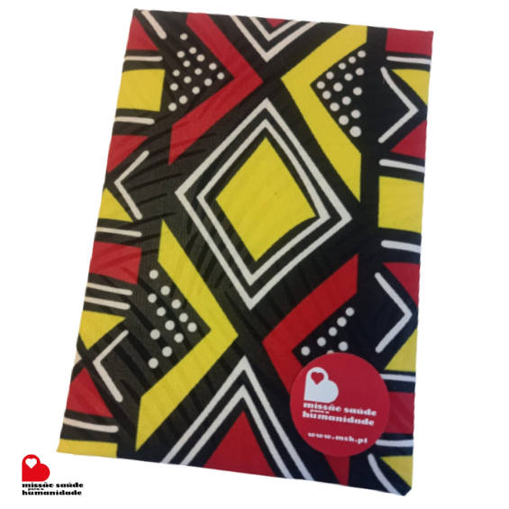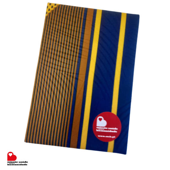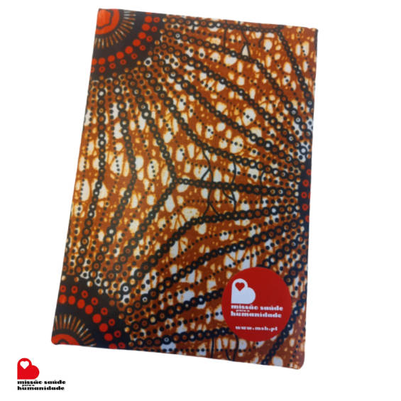 Com capa dura e encadernadas à mão com tecidos de Capulana com origem na Guiné Bissau, por voluntárias da Missão Saúde para a Humanidade.
