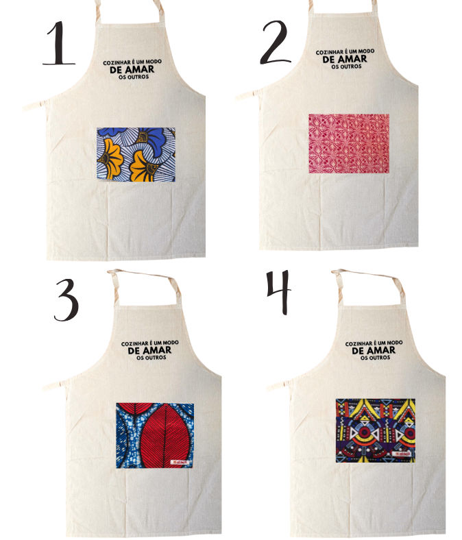 Ofereça um avental, com bolso em capulana e a frase "Cozinhar é um modo de amar os outros".
