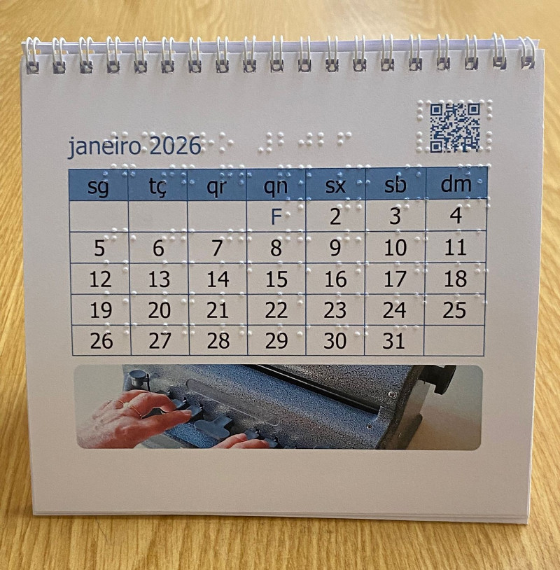 Calendário 2026 de mesa em Braille e caracteres ampliados produzido pelo Centro de Produção Documental da ACAPO - Associação dos Cegos e Amblíopes de Portugal.