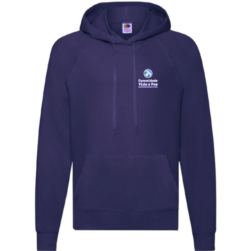 Camisola com capuz, em azul escuro, com o logotipo da Comunidade Vida e Paz (incluíndo o seu lema "Reconstruir Sentidos de Vida")