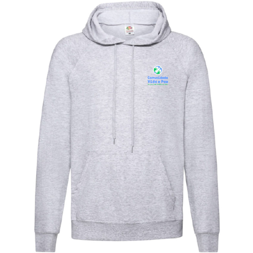 Camisola com capuz, em cinza, com o logotipo da Comunidade Vida e Paz (incluíndo o seu lema "Reconstruir Sentidos de Vida")