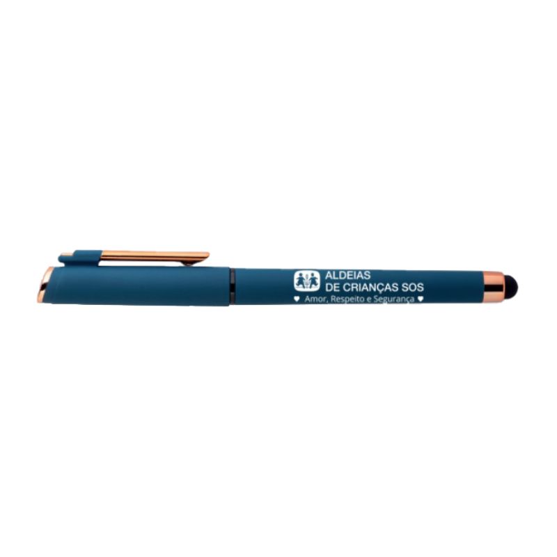 Caneta Solidária Aldeias de Crianças SOS; estampagem em branco com o logotipo da instituição junto com a mensagem "Amor Respeito e Segurança".