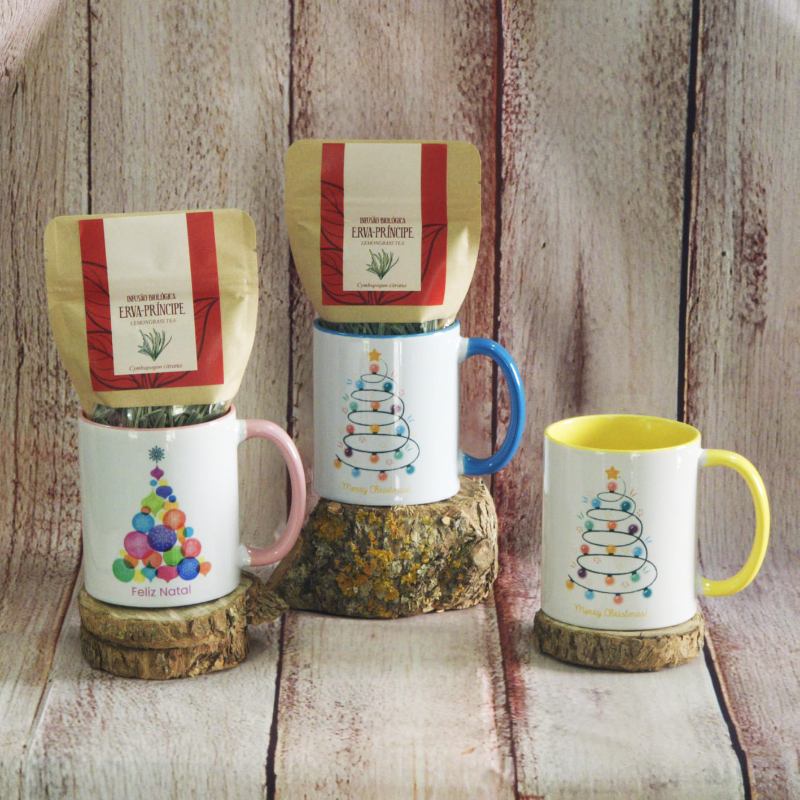Conjunto de caneca em cerâmica personalizável e infusão biológica (10g).