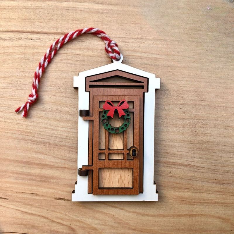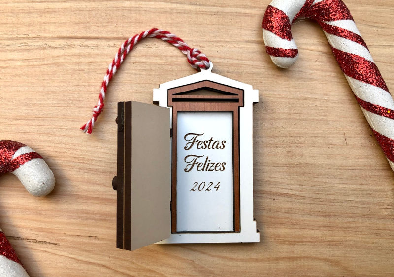Enfeite de Natal em forma de porta, com nome ou pequena mensagem personalizávelno interior, que pode usar por exemplo: