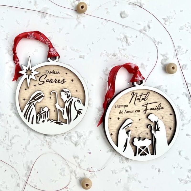 Leve a verdadeira essência do Natal para sua casa com estes enfeites com a Sagrada Família em madeira, personalizada com nome de família, com o ano, ou com uma frase especial. Um enfeite cheio de significado, perfeito para quem deseja celebrar esta época com fé, amor e tradição.