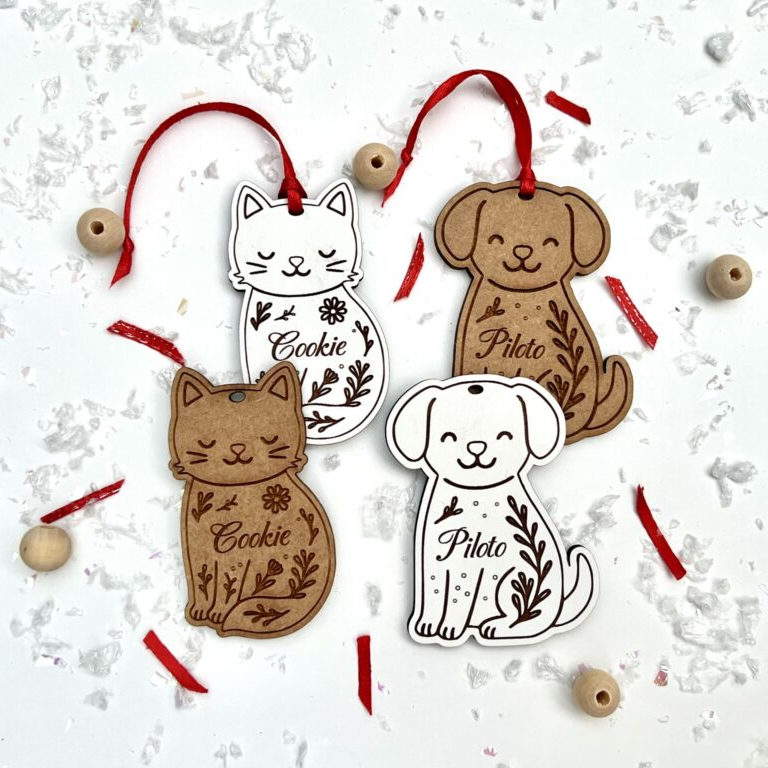 Enfeites de Natal em forma de cão e de gato, personalizáveis com os nomes dos animais de estimação.
