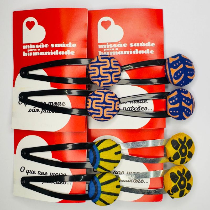 Conjunto de 2 ganchos de cabelo com peças revestidas a capulana (tecido tradicional trazido da Guiné Bissau).