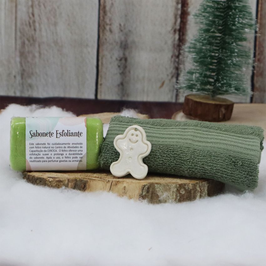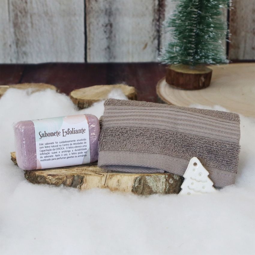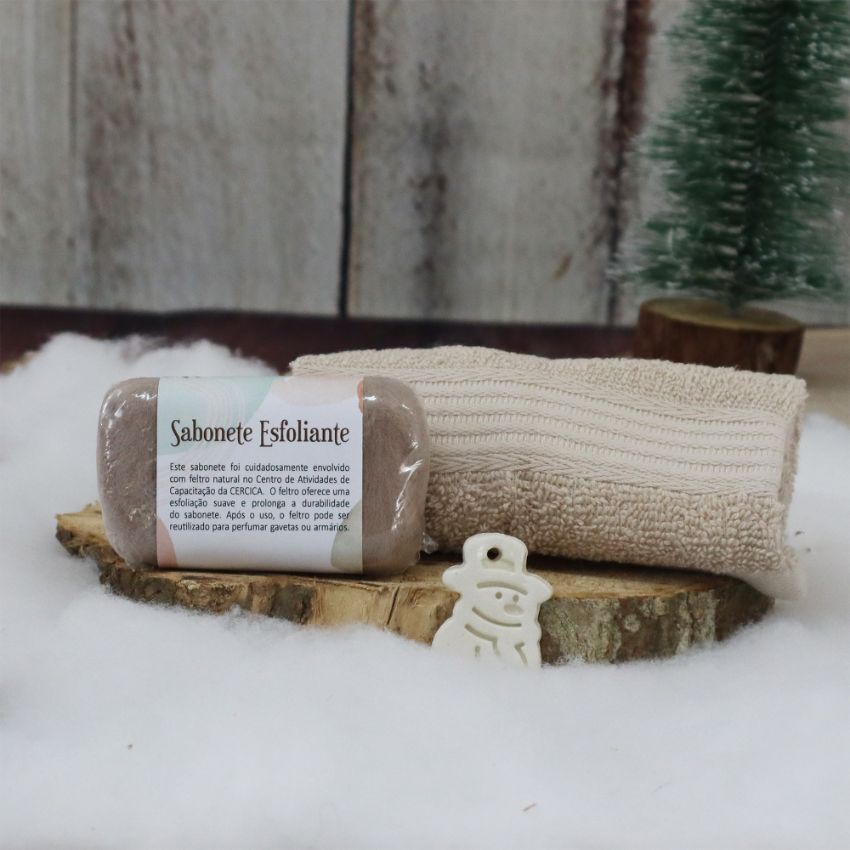 Conjunto de Sabonete esfoliante de feltro e toalha de rosto.