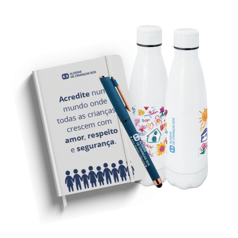 Pack Família Aldeias de Crianças SOS - Caneta, Garrafa térmica e Caderno A6