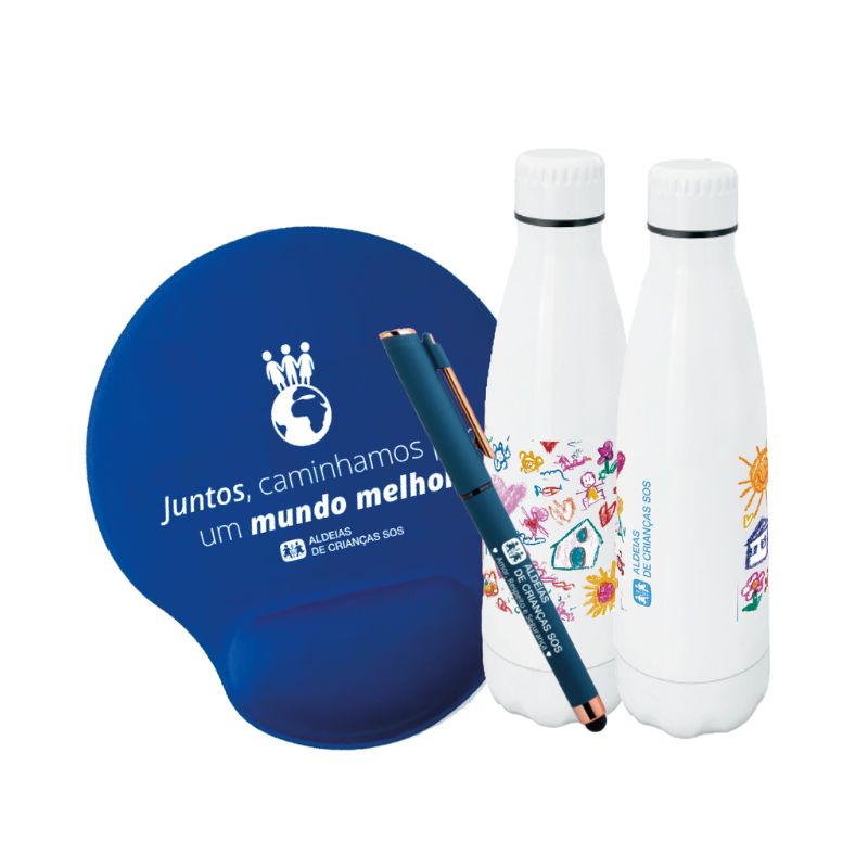 Pack Segurança Aldeias de Crianças SOS - Caneta + Garrafa térmica + Tapete de rato