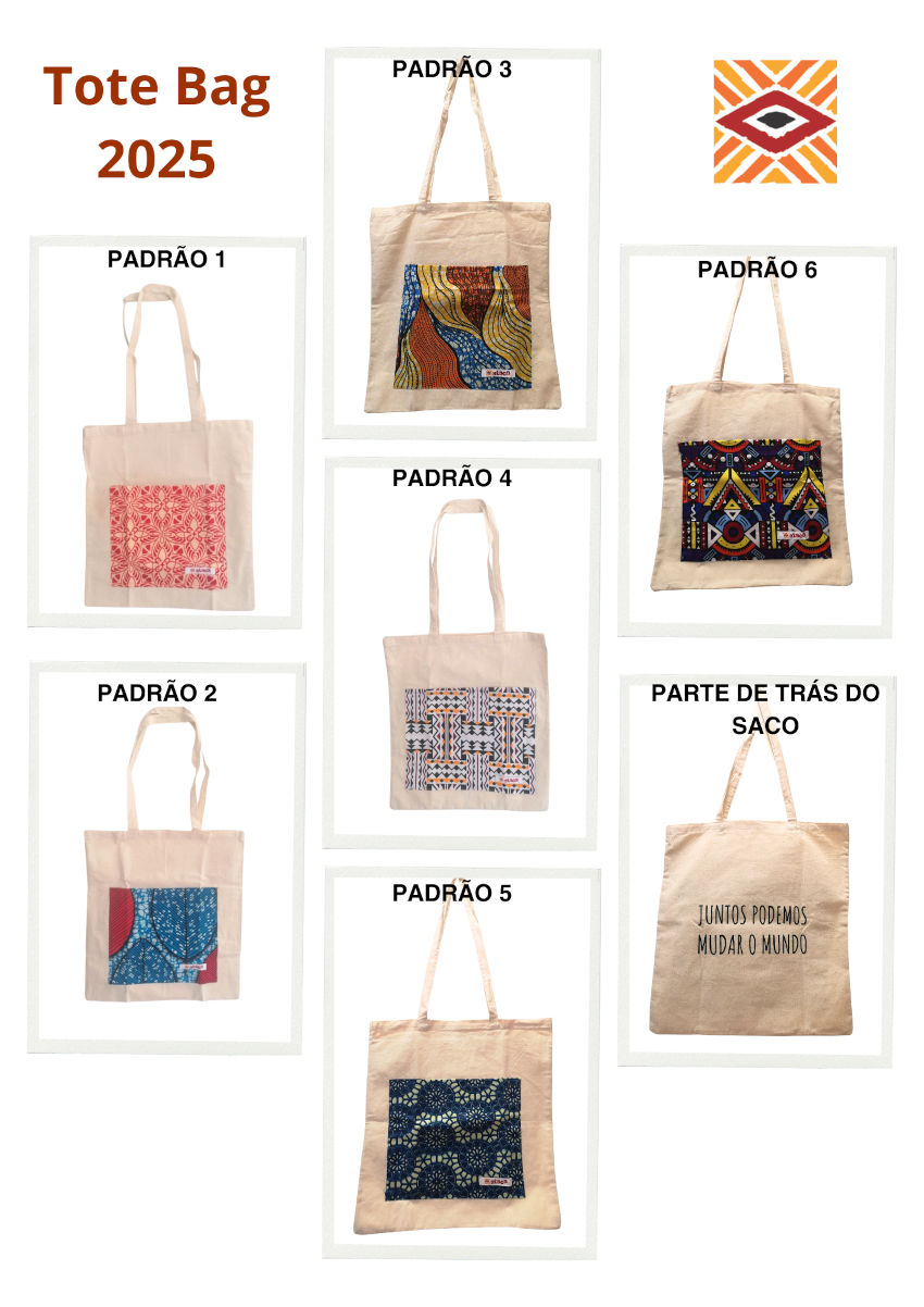 Saco 100% algodão (180 gramas) com bolso em capulana e a frase “Juntos podemos mudar o mundo!” com vários padrões disponíveis (veja acima).