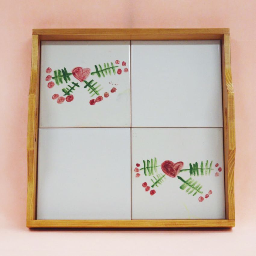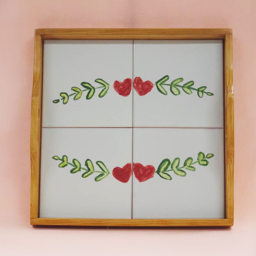 Tabuleiro de madeira com aplicação de 4 azulejos pintados à mão