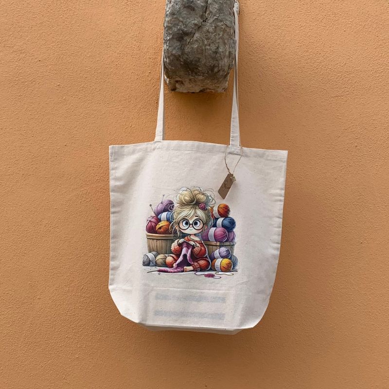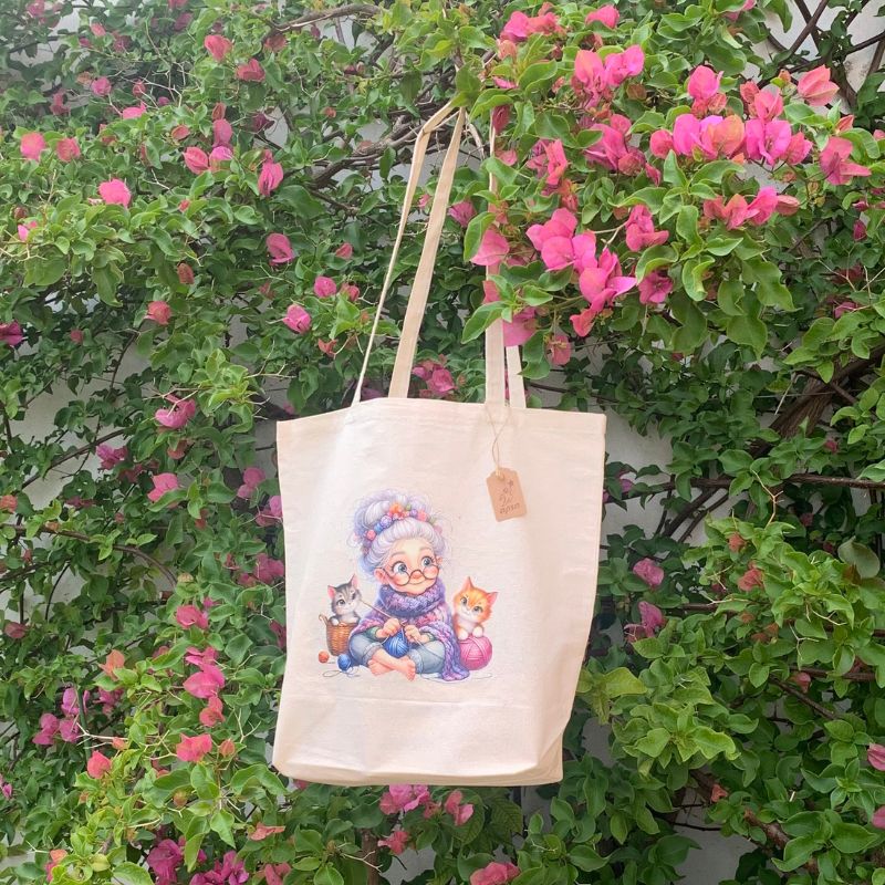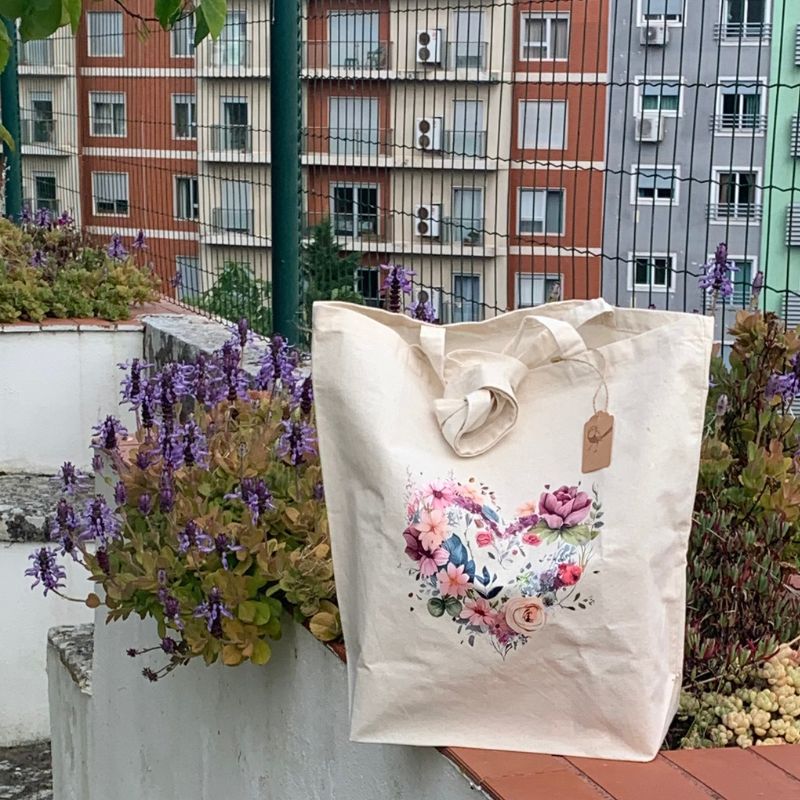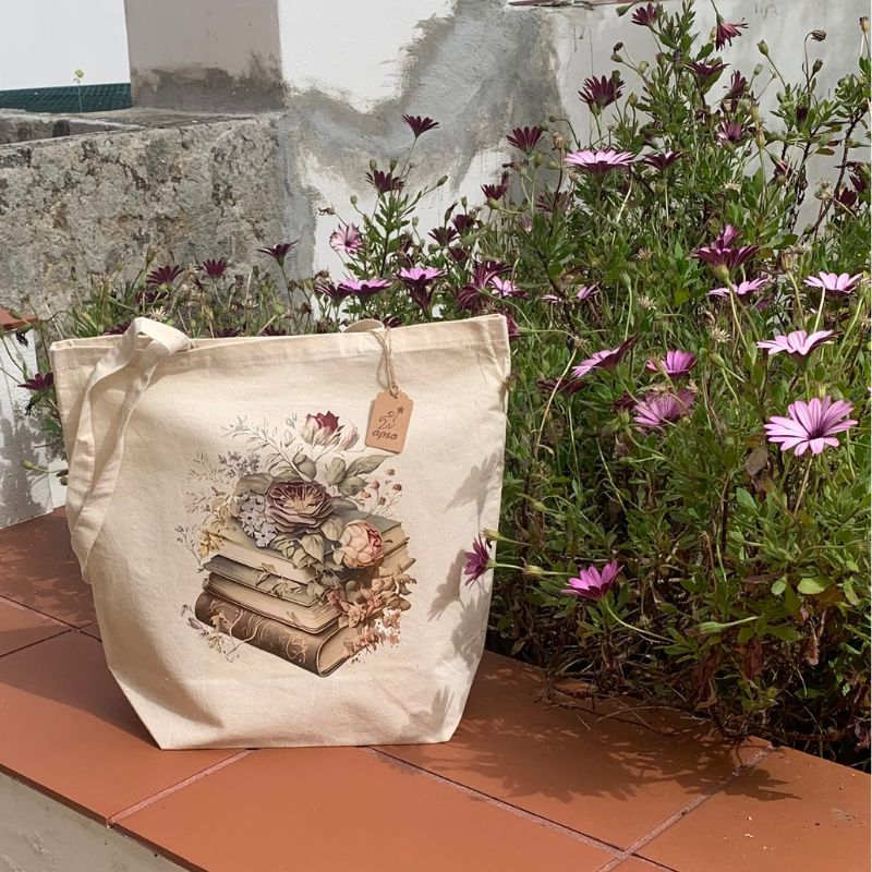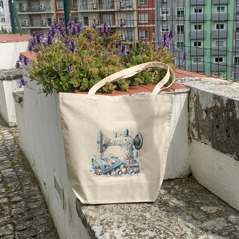 Sacos em pano crú, com vários padrões, criados artesanalmente no Atelier de Costura da APSA - Associação Portuguesa de Síndrome de Asperger.